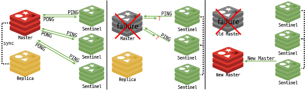 위 그림의 왼쪽처럼 센티널은 PING 메시지를 보내고 PONG 메시지를 받고 있다가 가운데 그림처럼 마스터로부터 일정 시간 동안 PONG 메시지가 없으면 마스터에 문제가 있다고 판단하고 오른쪽 그림 처럼 여러 개의 센티널이 마스터에 문제가 있다고 합의하면 레플리카를 새로운 마스터로 승격시킵니다.