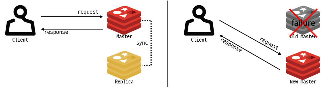 앞에서 언급한 고 가용성의 이야기를 기술적인 용어를 섞어 이야기 해 보겠습니다. 원래 서비스를 처리하던 서버를 master(마스터), 대기하고 있는 서버를 replica(레플리카)라고 하겠습니다. 좀 더 범용적인 언어로는 마스터와 레플리카 대신 Active와 Stanby라는 단어가 있지만 Redis에서 사용하는 언어를 사용하겠습니다.