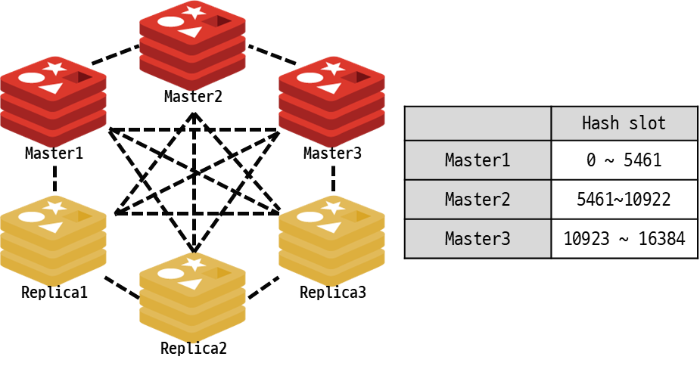 레디스 클러스터는 구성하기 위해서는 위 그림 처럼 최소 6개의 노드가 필요합니다. 그 중 3개의 노드는 마스터로서 동작하고, 나머지 3개는 마스터의 레플리카로서 동작합니다. 한 가지 특이한 사항은 각 마스터는 중복된 데이터를 저장하지 않고 데이터의 일부만 가지고 있습니다.