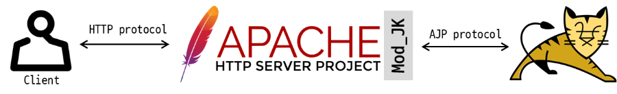 위 그림에서 사용자는 웹 브라우저 같은 HTTP 프로토콜을 이용하는 클라이언트를 통해 웹 서버에 요청을 보냅니다. 웹 서버는 사용자의 요청을 받아 정적 콘텐츠일 경우 HTML 같은 정적 웹페이지 파일을 전달해주고, 동적 콘텐츠일 경우 아파치의 모듈인 mod_jk에게 요청을 넘겨줍니다. mod_jk는 AJP프로토콜을 이용해서 톰켓과 통신을 하고 요청에 대한 결과를 웹서버를 통해 클라이언트로 전달하게 됩니다.