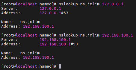 위 그림을 통해 방금 구축한 DNS를 통해 ns.jmlim의 IP가 192.168.100.1이라는 것을 알 수가 있습니다.