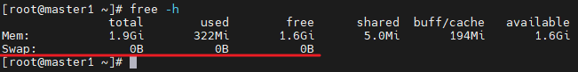 free 명령을 통해 swap 공간이 다음과 같이 oB로 출력되어야 합니다.