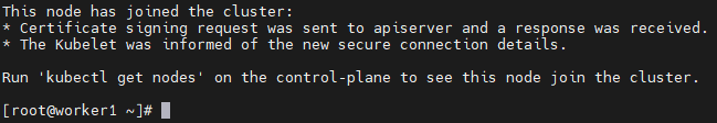 그다음으로 worker1과 worker2를 참여시키기 위해서는 위 화면에서 kubeadm join으로 시작하는 메시지 전부를 복사해서 worker에 붙여 넣으면 됩니다. 이때 주의해야 할 것이... 이 토큰의 값은 유효시간이 24시간이므로 24시간 안에만 사용할 수 있습니다. 만약, 24시간이 넘어간다면 새로 토큰을 발급해서 추가해야 합니다.