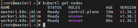 그리고, master1에서 다시 한번 노드 확인 명령을 내리면 worker1과 worker2가 추가된 것을 확인할 수 있습니다.