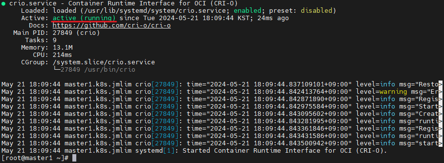 따라서 아래와 같이 CRI-O가 active 상태인것 만 확인하면 됩니다.