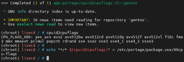 echo "*/* $(cpuid2cpuflags)" > /etc/portage/package.use/00cpu-flags