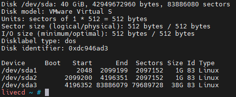 찾았습니다! 디스크의 위치는 /dev/sda이고, 용량은 40 GiB입니다.