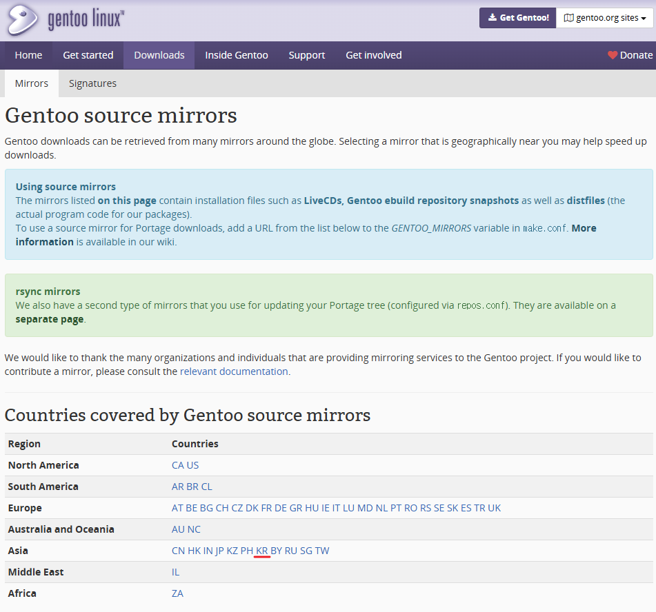 미러 주소인 https://www.gentoo.org/downloads/mirrors/로 들어가면 국가와 미러 사이트를 들어갈 수 있습니다.